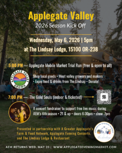All funds will support the return of the Applegate Evening Concert Series, kicking off May 20th The Lindsay Lodge & Restaurant during the Applegate Evening Market. We’ve got an incredible lineup this year. The full calendar is coming soon.