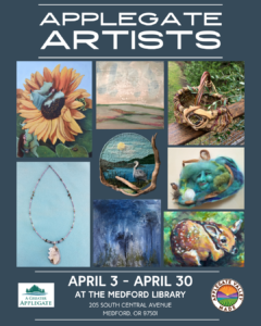 Paintings, weaving, basketry, fiber art, and jewelry all made by Applegate based artists on display April 3 – April 30. The Medford Library is located at 205 South Central Avenue, Medford, OR 97501.